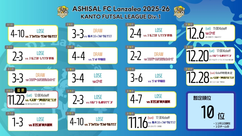 【終了】今季ラストホームゲーム!関東フットサルリーグ1部 第19節 開催日:11月16日(日)