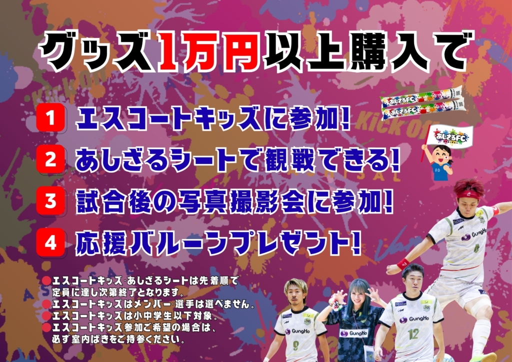 ・エスコートキッズは先着順のため数に限りがございます。またあしざるFCランツァーレのいずれかの選手となり、メンバーは選べません。あらかじめご了承ください。